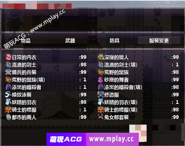 装备:更换装备,包括一个武器(无法卸下),一个防具(最强防具是兜裆布),三个挂饰(提升特殊能力耐性。)