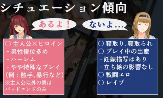 情色场景:主角与女主角之间自愿的性行为(包括正常和非正常玩法(触手、SM、轻度凌辱))。